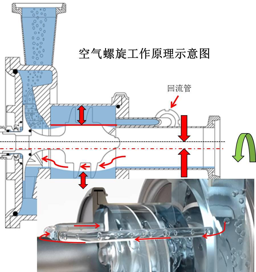 说到这款中标的明星产品LKH Prime离心泵,首先要介绍的就是它充满想象力的创新型设计——空气螺旋技术。在CIP回流液进入到空气螺旋腔体以后,巨大的离心力产生一个液环,泵壳与空气螺旋的偏心设计结构能够确保空气螺旋的上部完全被液体充满,同时将螺旋底部气穴中的气体一次性规整地导入泵腔中,能有效地防止气蚀损坏泵腔内部结构。这就是空气螺旋技术的运行原理。